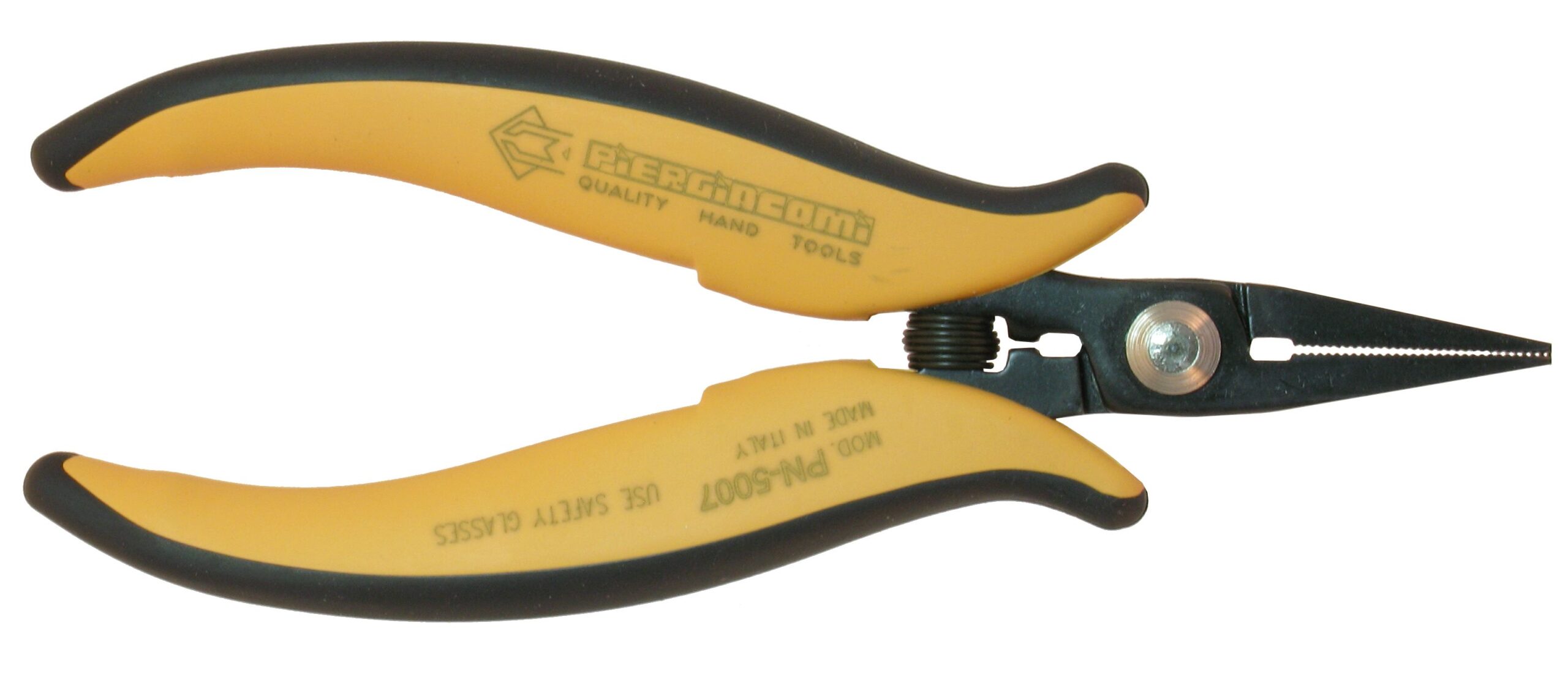 Ploché kleště s dlouhými hladkými čelistmi, vhodné pro uchopení součástí na těžko přístupných místech a pro jemné elektronické aplikace. Tloušťka oceli 3mm. Celková délka 160mm. Model rukojeti