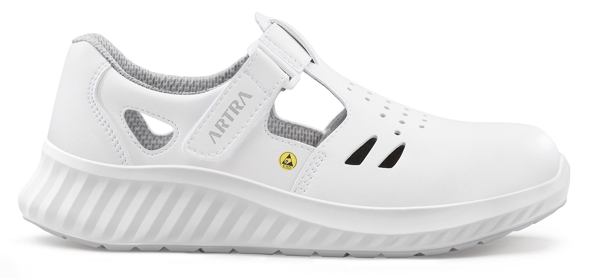Die Arbeitssandalen ARMEN 9007 1010 O1 FO ESD von Artra sind vegane, leichte und atmungsaktive Schuhe ohne Zehenschutzkappe – perfekt für Innenbereiche mit ESD-Anforderungen.